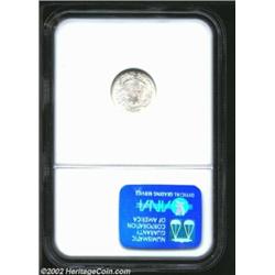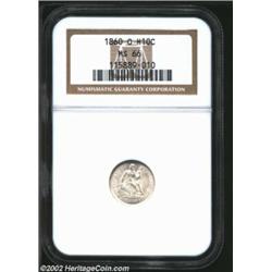 1860-O H10C MS66 NGC. A brilliant and intensely lustrous Gem with a bold strike and clean surfaces. A faint staple scratch above the bow is only mentioned for accuracy. The M in DIME is die clashed (as made) below the raised arm of Liberty. Population: 7 in 66, 1 finer (7/02). Important notice: We expect to be auctioning lots at the rate of 200-250 per hour. Sometimes eBay Premier live bid software cannot keep up with that pace, so we strongly recommend that you place a realistic proxy bid now as insurance to avoid disappointment. Also please note that all Heritage/CAA lots purchased through eBay Premier carry a 20% Buyer's Premium. Please make sure you read the Terms and Conditions.