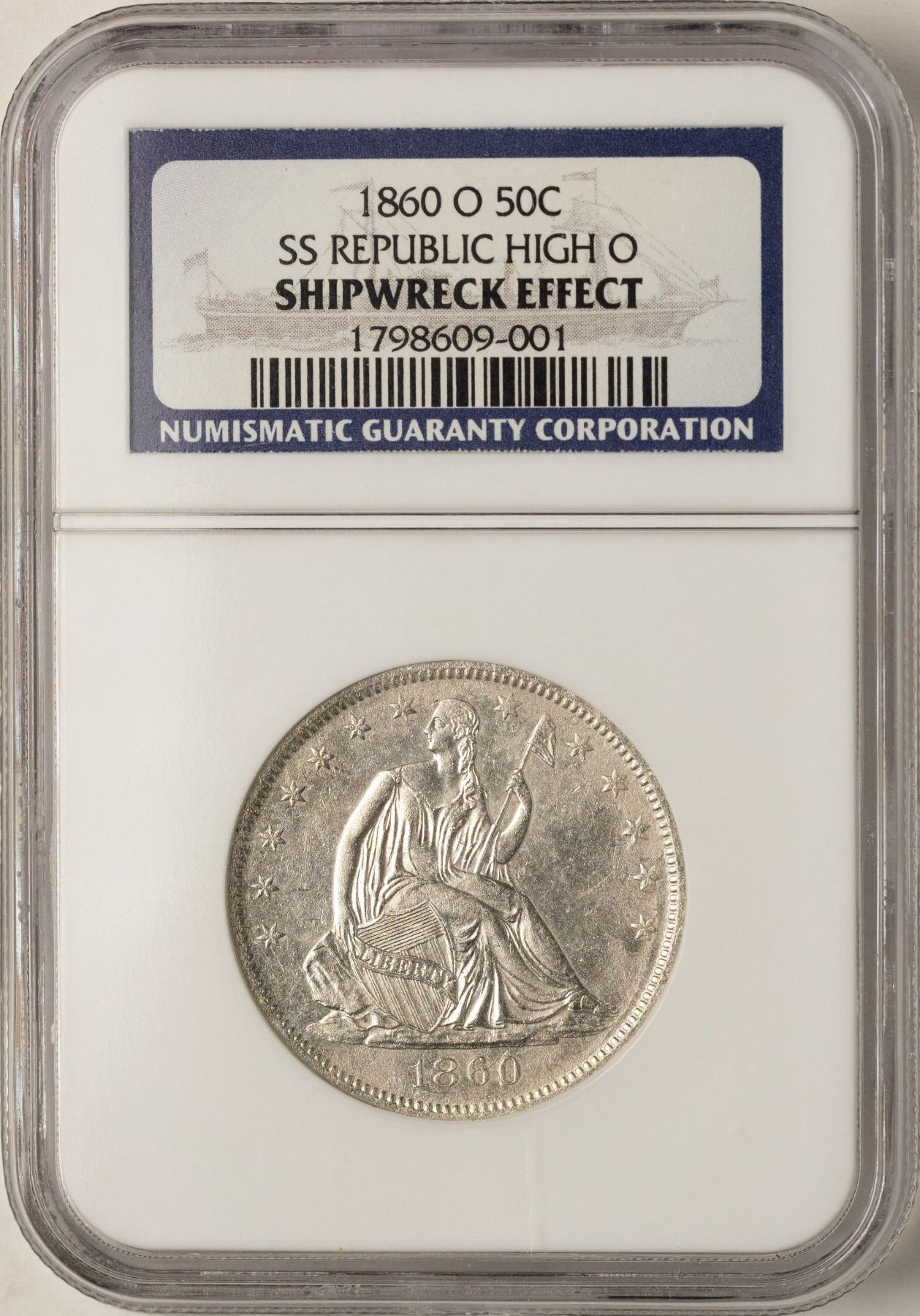 One 1860-O High O SS Republic Seated Liberty Half Dollar Coin NGC Shipwreck Effect w/Book.