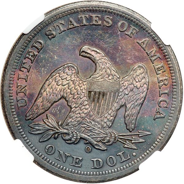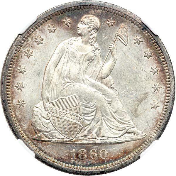 1860-O Liberty Seated Dollar. NGC graded MS-61. Nicely toned especially on the reverse. A nice strike with some obverse marks.