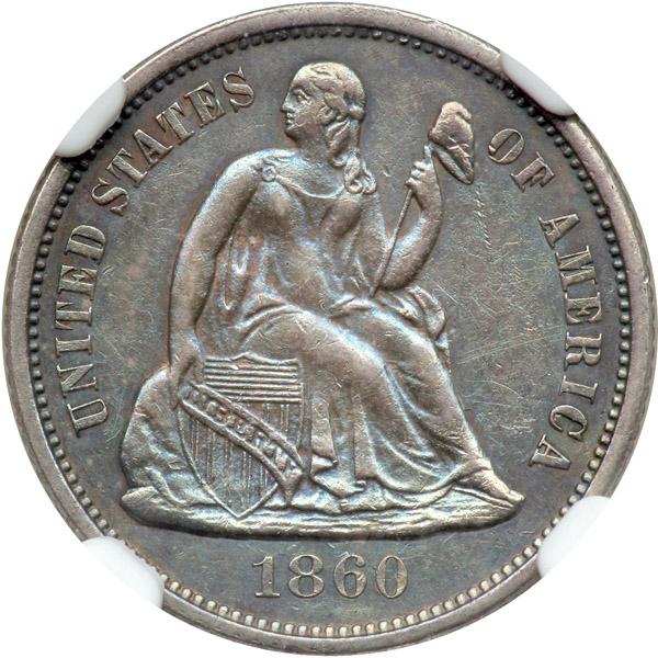 1860-O. NGC graded AU-58. Nice blue and violet toning. Popular Key Date. Only 40,000 struck. Only one variety is known of this date. From the low mintage, only a minuscule percentage has managed to survive. There are very few few Mint State examples known of this date, which are extremely expensive; and even high grade circulated pieces such as that offered here are very rare! Pop 1; 2 finer. Only 35 in total graded at NGC .