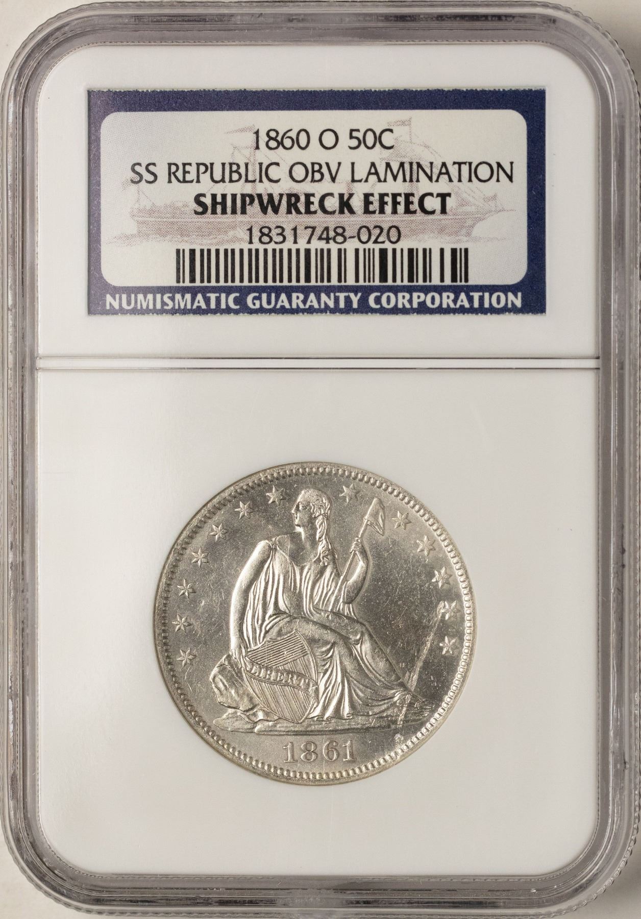 One 1860-O Obverse Lamination Seated Liberty Half Dollar Coin NGC Shipwreck Effect w/Book.