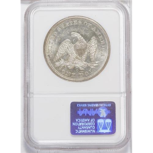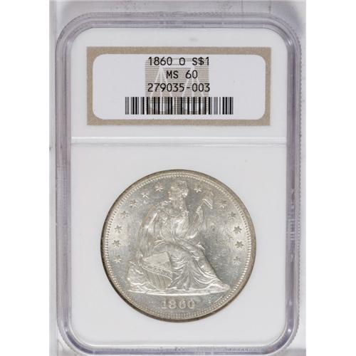 <B>1860-O<img border='0' src='http://www.heritagecoins.com/images/star.gif' width=10 height=10>$1> MS60 NGC.</B></I> Light golden patina covers the lustrous and reflective fields. Sharply struck, though numerous abrasions in the fields and some on the devices limit the grade.