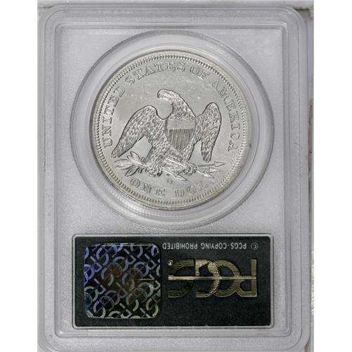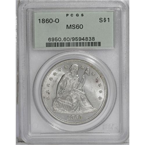 <B>1860-O<img border='0' src='http://www.heritagecoins.com/images/star.gif' width=10 height=10>$1> MS60 PCGS.</B></I> This fully lustrous and virtually brilliant silver dollar is well struck and shows only faint hairlines. Tiny spots near stars 2 and 10 are barely worthy of mention. Encapsulated in a green label holder.