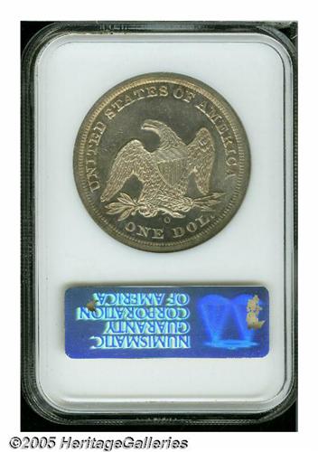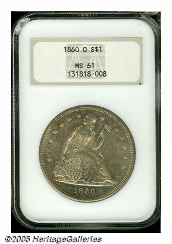 <B>1860-O<S$1> MS61 NGC.</B></I> One of the most frequently offered of No Motto Seated dollars, this piece has bright surfaces that are visited with splashes of light golden-brown patina. The design elements are sharply struck, and nicely highlighted against the partially prooflike fields. The reverse is very well preserved, but the obverse displays scattered, minute contact marks and scuffs. Overall, a fairly attractive coin for the grade designation.<BR><I>From The Dr. John L. Pellegrini Collection of Liberty Seated Dollars.</B></I>
