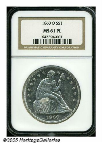 <B>1860-O<S$1> MS61 Prooflike NGC.</B></I> One of the most frequently offered of No Motto Seated dollars, this piece has bright surfaces that are virtually white, and display several light contact marks scattered about, mostly in the fields. The design features are generally well impressed, except for weakness in the hair on the top of Liberty's head and in most of the star centers.