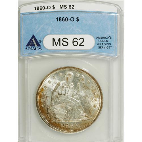<B>1860-O S$1 MS62 ANACS.</B></I> Splashes of orange toning invigorate the margins of this well struck New Orleans dollar. The upper obverse is moderately abraded, but cartwheel luster dominates the fields.<BR><BR><b>Shipping:</b> Coins & Currency (<a target="_blank" href="http://www.heritageauctions.com/common/shipping.php">view shipping information</a>)