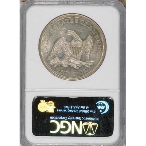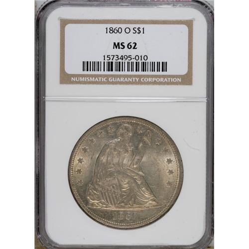 <B>1860-O S$1 MS62 NGC.</B></I> Well struck design elements stand out against the backdrop of semi-prooflike fields when the coin is tilted under a light source. Warm golden-gray patination graces both sides, as does nice luster, though the flow of the latter is somewhat interrupted by light scuffs and contact marks.<BR><BR><b>Shipping:</b> Coins & Currency (<a target="_blank" href="http://www.heritageauctions.com/common/shipping.php">view shipping information</a>)