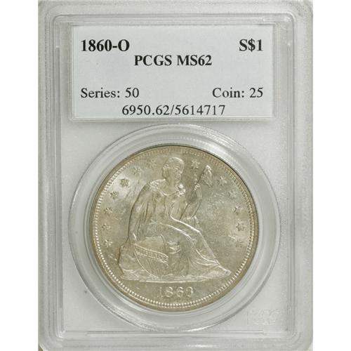 <B>1860-O S$1 MS62 PCGS.</B></I> This highly lustrous antebellum silver dollar has pleasing detail and soft pearl-gray toning. Scattered abrasions on each side account for the grade.<BR><BR><b>Shipping:</b> Coins & Currency (<a target="_blank" href="http://www.heritageauctions.com/common/shipping.php">view shipping information</a>)