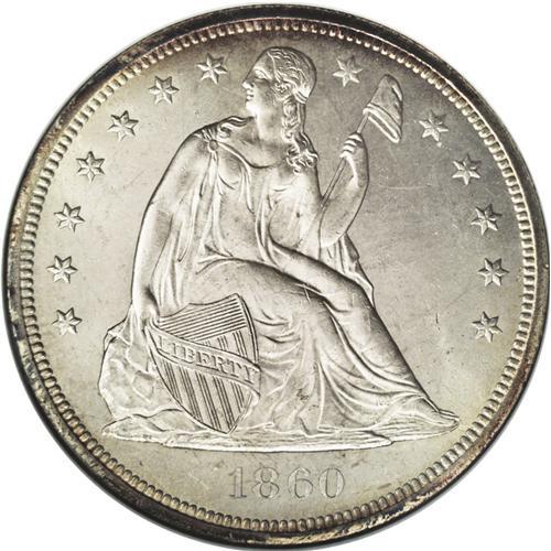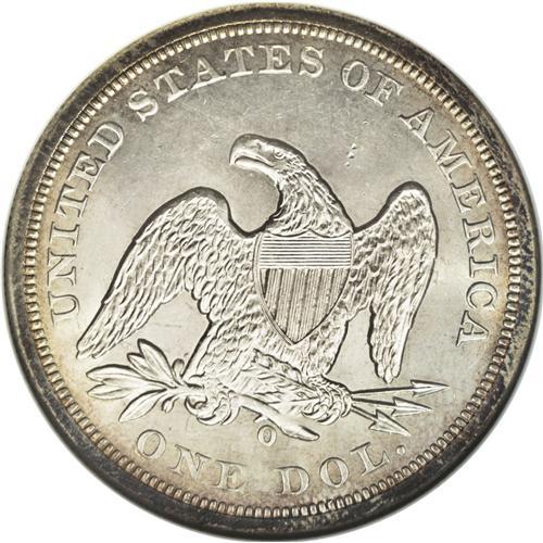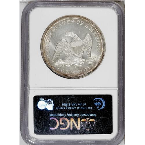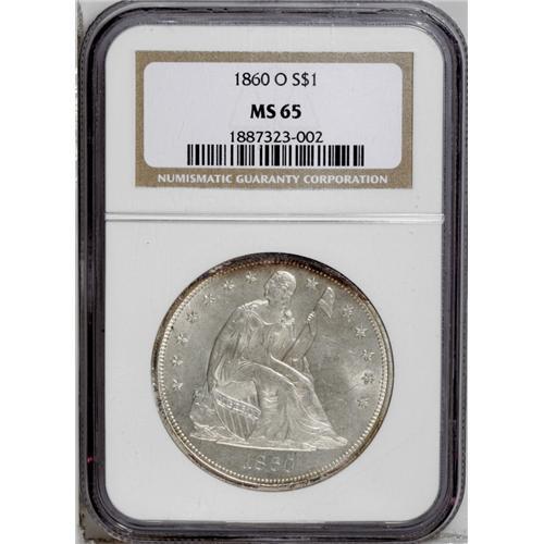 <B>1860-O<img border='0' src='http://www.heritagecoins.com/images/star.gif' width=10 height=10>$1> MS65 NGC.</B></I> As anyone who is remotely aware of 19th century type coins knows, the 1860-O dollar is one of the two most common dates available in Mint State in the entire series. Several bags of this date surfaced in 1962, and since that time, it has remained as one of the most available (and usually most attractive) Seated dollars in lower Uncirculated grades. But it must be understood that it is only in these lesser grades that the '60-O is a common issue. As a Gem, it ranks among several other dates in condition rarity, and, in fact, is rarer than at least three dates in this lofty grade: the 1854, 1861, and 1864. This is a stunningly beautiful coin. It resembles all other mint state '60-O dollars with its bright, partially reflective surfaces, but here the similarities end. What it lacks are the numerous, and oftentimes distractingly large, bagmarks seen on most dollars of this issue created by residing for a century in a mint sewn bag. There are a few small, inconsequential marks on each side, but the only flaw that deserves individual mention is a small milling mark in the reverse field above the eagle's neck. While primarily a brilliant coin, the borders are touched with just the slightest hint of pinkish-golden color, but this really does little to alter the perception of this dazzling coin as brilliant. Of singular importance to the date or type collector. Census: 9 in 65, 4 finer (7/06).