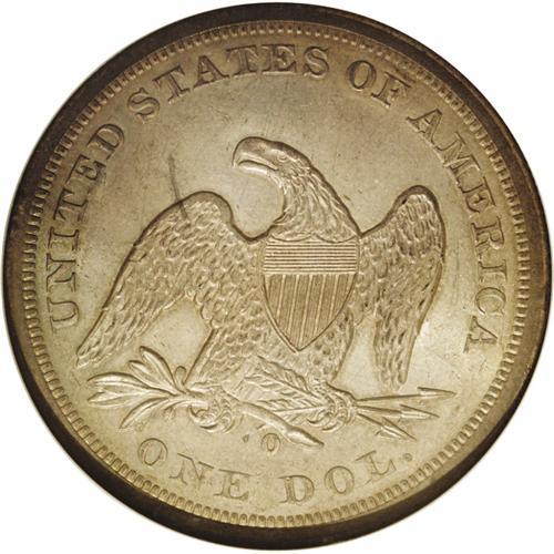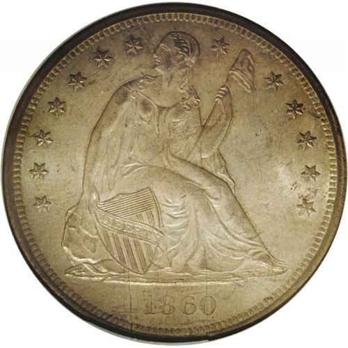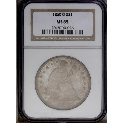 <B>1860-O<img border='0' src='http://www.heritagecoins.com/images/star.gif' width=10 height=10>$1> MS65 NGC.</B></I> While 1860-O dollars were probably intended primarily for the export trade, several tens of thousands were held domestically. This, along with the release of several thousand pieces by the Treasury during the 1962-1964 distribution, has resulted, in what David Bowers (1993) calls : "...the most plentiful Liberty Seated dollar in Mint State...." Most Uncirculated specimens are in the MS60 to MS63 levels, in which several hundred pieces have been certified. However, only about 60 near-Gems and better examples have been graded.<BR> The present MS65 '60-O displays smoky-gray patina with subtle sky-blue and gold undertones. Nicely preserved surfaces exude soft luster and sharply impressed design features, though the centers of the stars along the right border are soft. A rather pleasing specimen that is devoid of the serious bagmarks that are often seen on large, heavy dollars such as this. Census: 9 in 65, 4 finer (3/06). <BR><BR><B>Important notice:</B> Heritage usually auctions material at the rate of 200-250 lots per hour. On some occasions eBay Live bid software or the Internet may not be able to keep up with the pace of the auction. We recommend placing a realistic absentee bid now as insurance to avoid disappointment. Occasionally the auctioneer may eliminate or reject an eBay Live bid, and the auctioneer may also reopen a lot after the close of the eBay live bidding (usually because we missed an audience bid), and may reject your bid even if it shows you as the winning bidder. By bidding via eBay Live, you agree that Heritage may award the lot to another bidder at its sole discretion under the circumstances described above or any other reasonable circumstances. Since eBay bids are not shown to us until we open the lot on the floor, we treat those bids just like floor bids. In most cases the floor responds before the eBay bid is presented to us, due to Internet lag time, so for consistency we have made it a policy that floor bids are always considered first over tie eBay live bids. Also please note that all Heritage lots purchased through eBay Live carry a 20% Buyer's Premium. Please make sure you read the Terms and Conditions before you bid. This lot is being auctioned in conjunction with a live floor auction by Heritage Galleries & Auctioneers. All final auction and invoice information will be supplied by Heritage Galleries & Auctioneers, and all other information should be considered preliminary. Lot:2190 <BR><BR><B>Winning Notification and Billing:</B> After the FINAL session in this auction is complete, Heritage will send e-mail and snail mail invoices. This process normally takes several days. All final auction and invoice information will be supplied by Heritage Galleries & Auctioneers, and all other information should be considered preliminary. <BR><BR>This auction will be conducted on a live auction floor and over the Internet through eBay Live. If you choose to place an absentee bid, please take a moment to <font color='#0000ff'><u><a href='http://pages.ebay.com/liveauctions/help/before/laabsentee.html'>learn how eBay Live absentee bidding works</a></u></font><font color='#000000'>