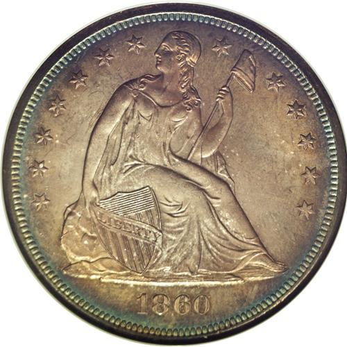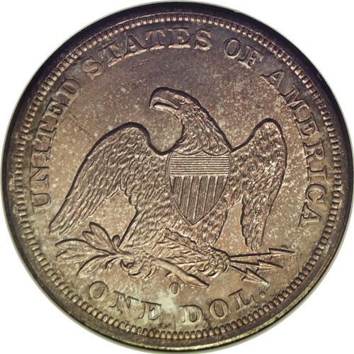 <B>1860-O S$1 MS66 NGC.</B></I> Ex: Foxfire. Numismatic researchers agree that several thousand Mint State examples of the 1860-O Seated dollar were released during the 1962-64 U.S. Treasury releases of silver dollars; the disagreement is over the number released, which ranges from 1,000 on the low side to 6,000 on the high side. Bowers-Borckardt says of these pieces, "Nearly all of these coins were heavily bagmarked and today fall in the MS-60 or slightly finer category." A gander at the NGC and PCGS population data confirms that as of this writing (11/06), a total of 830 examples have been certified from MS60 to MS63. The grade breakdown is (all figures for NGC and PCGS combined): MS60, 213 coins; MS61, 276 coins; MS62, 267 coins; and MS63, 95 coins. The number of MS64 pieces, however, is only 38, with 18 MS65 examples. There are only four MS66 pieces, all at NGC. <I>This piece is among the four finest known at either service.</B></I> Notice, then, how many coins are clustered in the MS60 to MS63 grade echelons, and it becomes obvious that a lower estimate of 1,000 Mint State coins is more nearly correct than higher estimates (it seems unlikely that more than a couple of hundred Mint State coins remain uncertified).<BR> The Bowers-Borckardt silver dollar <I>Encyclopedia</B></I> quotes Bruce Amspacher, who wrote, "The average BU 1860-O dollar earned the nickname of 'Quaker Oats dollar,' because it looks like it was shot from guns." Clearly, this remarkable specimen is <I>not</B></I> from those humdrum Treasury coins. Indeed, it has the look of a coin that has been faithfully and carefully preserved for many years in a single cabinet. The surfaces have a light, even, consistent amber-gold patina on both sides, accented by aqua-blue rims on the obverse. Brilliant luster emanates from beneath fields that are fairly prooflike. A cluster of small, grade-consistent abrasions is noted in the left obverse field along Liberty's left (facing) arm. The strike is bold, although a few of the right-side stars lack full central details. A lovely and unimprovable coin.<BR><BR><b>Shipping:</b> Coin/Currency (<a target="_blank" href="http://www.heritageauctions.com/common/shipping.php">view shipping information</a>)