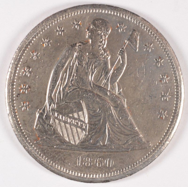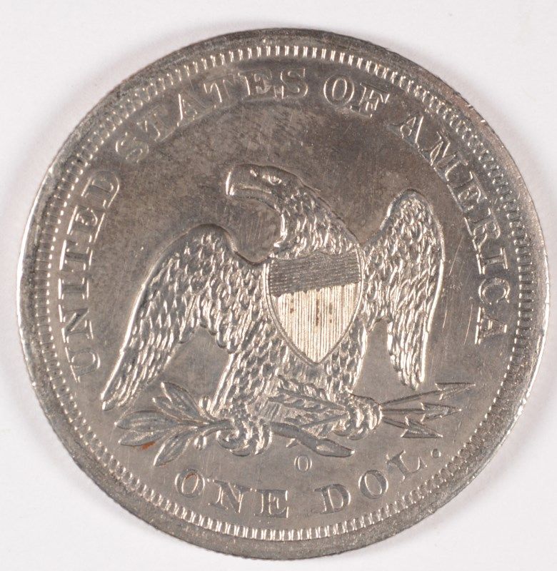 1860-O SEATED DOLLAR, MS-63 CLEANED, RARE HARD TO FIND, SEMI-PL