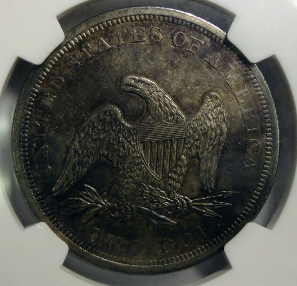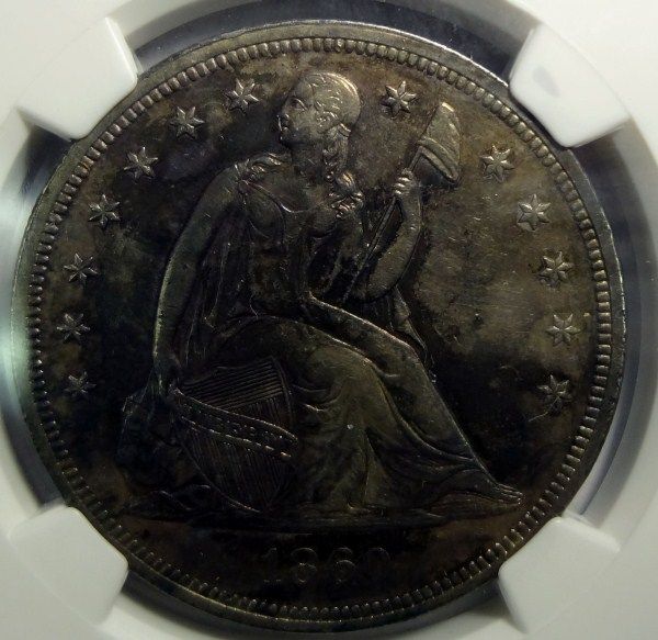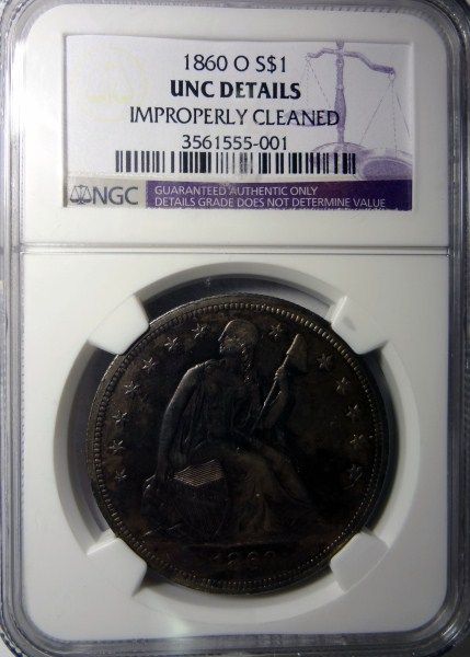 1860-O SEATED DOLLAR NGC UNC CLEANED A NICE BU COIN THAT WAS CLEANED LONG AGO