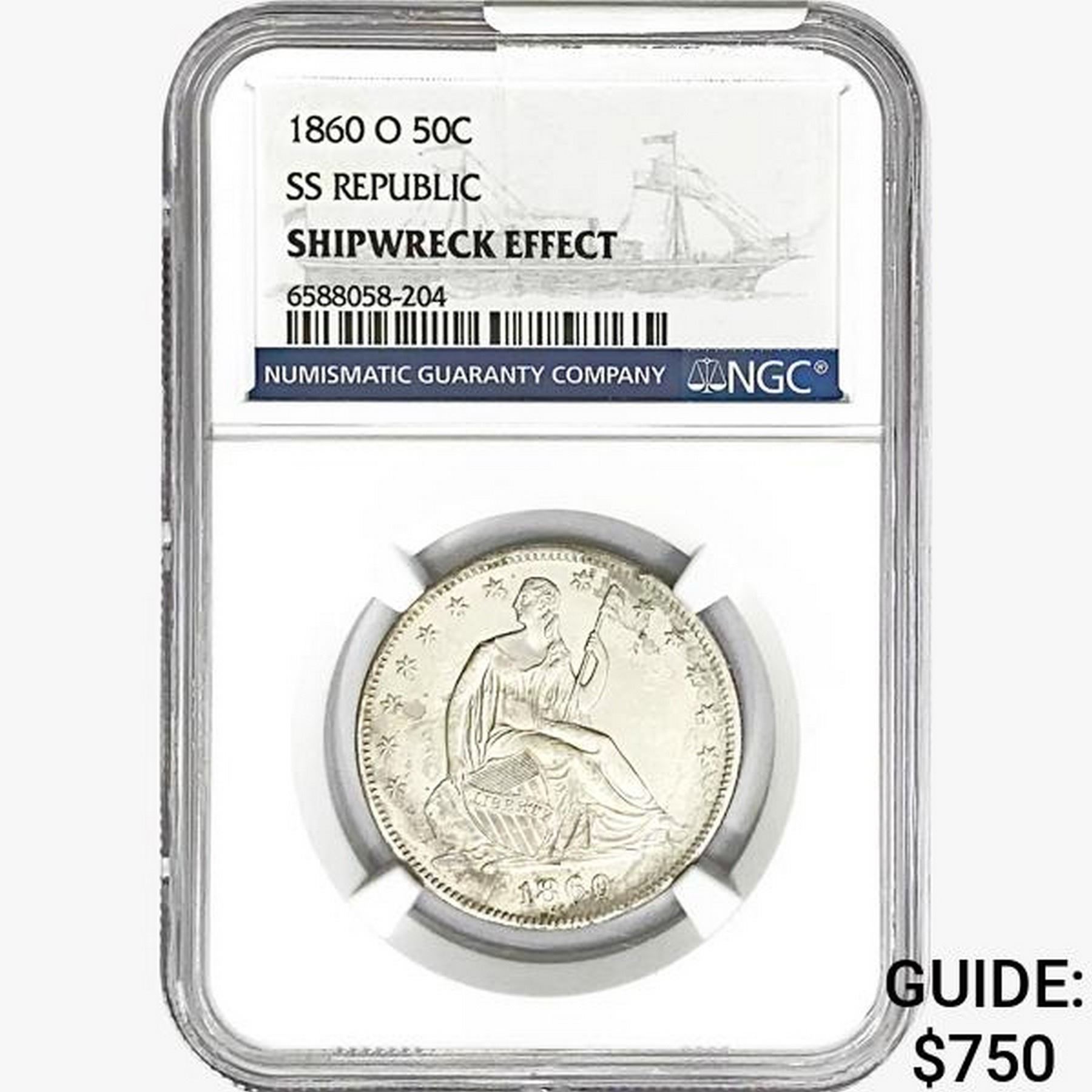 1860-O Seated Lib. 50C NGC Shipwreck Effect SS REP