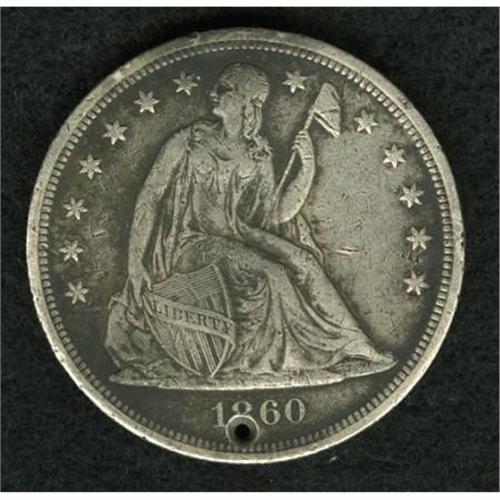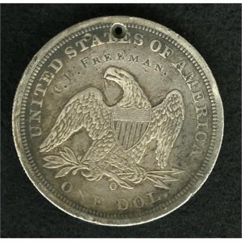 <B>1860-O Seated Liberty Dollar Counterstamped.</B></I> Seated Liberty dollar holed and single punched with the name <B>C.H. Freeman.</B></I><BR><BR><b>Shipping:</b> Coins & Currency (<a target="_blank" href="http://www.heritageauctions.com/common/shipping.php">view shipping information</a>)