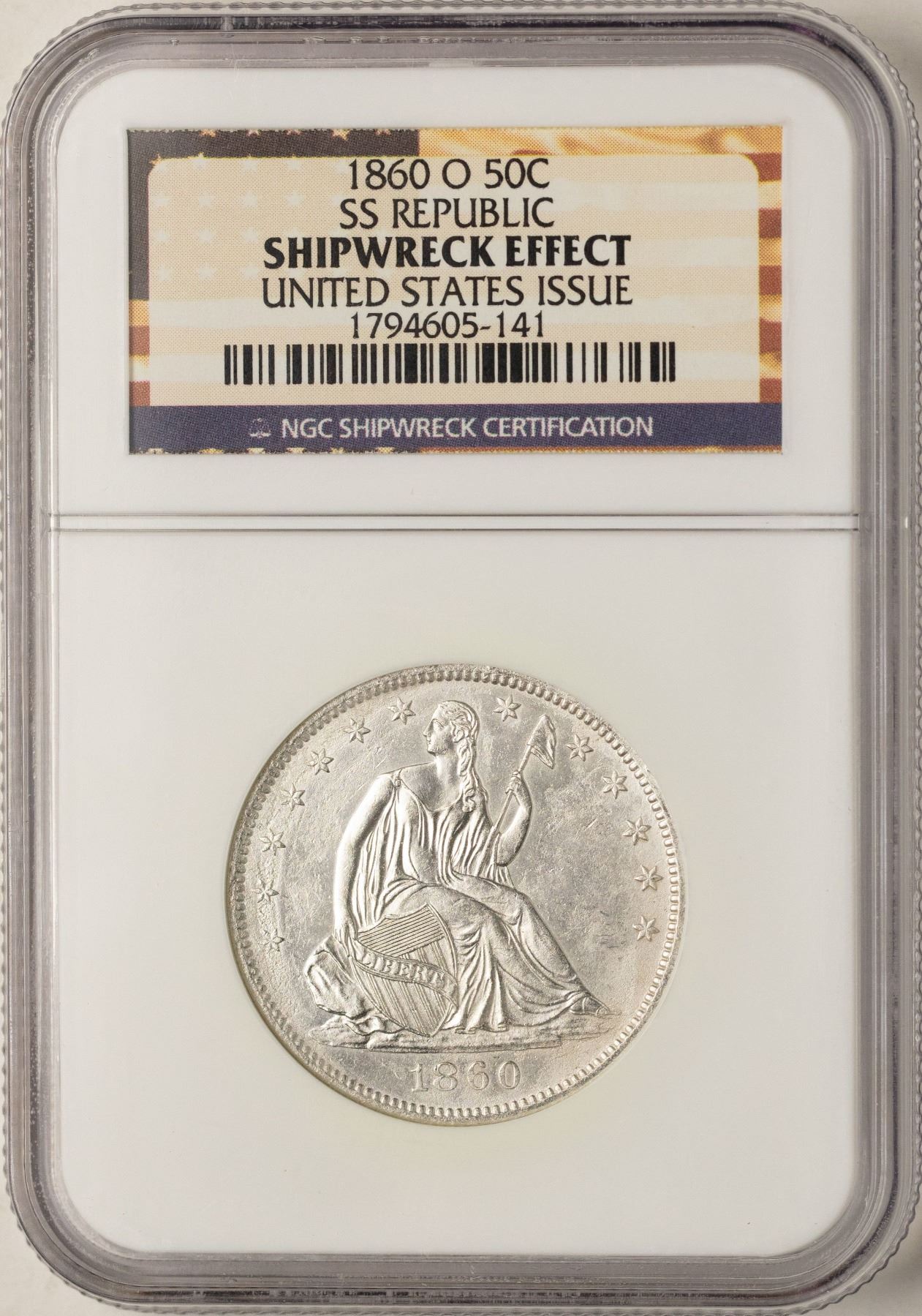 One 1860-O United States Issue Seated Liberty Half Dollar Coin NGC Shipwreck Effect w/Book.