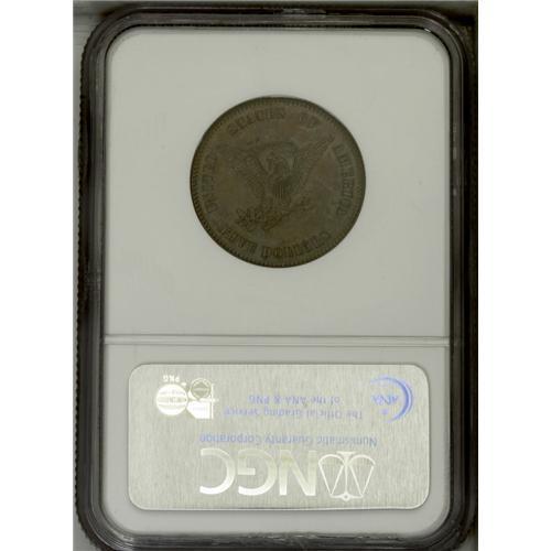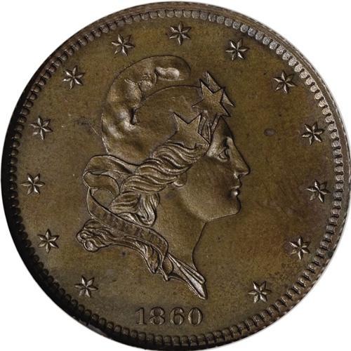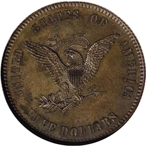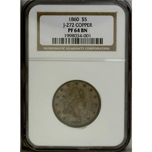 <B>1860 P$5 Five Dollar, Judd-272, Pollock-320, Low R.6, PR64 Brown NGC.</B></I> The obverse introduces the right facing bust of Liberty with three large stars on her cap, a familiar motif with the Standard Silver series, but first used on Judd-271 and Judd-272. The date is quite small. The reverse features a small eagle with a curved shield, clutching the banner E PLURIBUS UNUM in its beak along with the usual olive branch and arrows in its claws. Identical to Judd-283 except for the change in date. Struck in copper with a reeded edge. This pattern was for a large diameter, thin planchet Half Eagle, designed to keep unscrupulous individuals from hollowing out gold coins and replacing their content with a less valuable metal. This well struck specimen is chocolate-brown with blue-green highlights, and is smooth aside from trivial carbon.<BR><BR><b>Shipping:</b> Coin/Currency (<a target="_blank" href="http://www.heritageauctions.com/common/shipping.php">view shipping information</a>)
