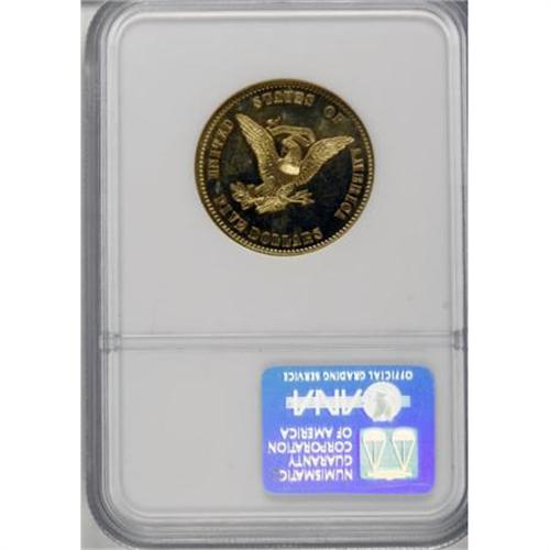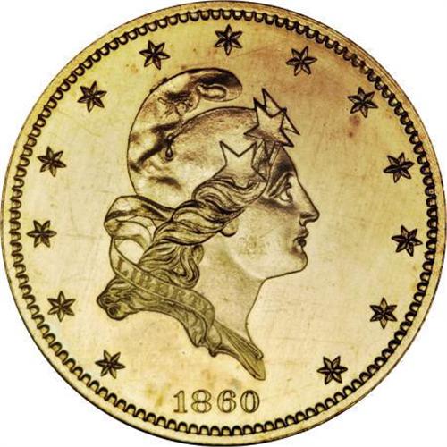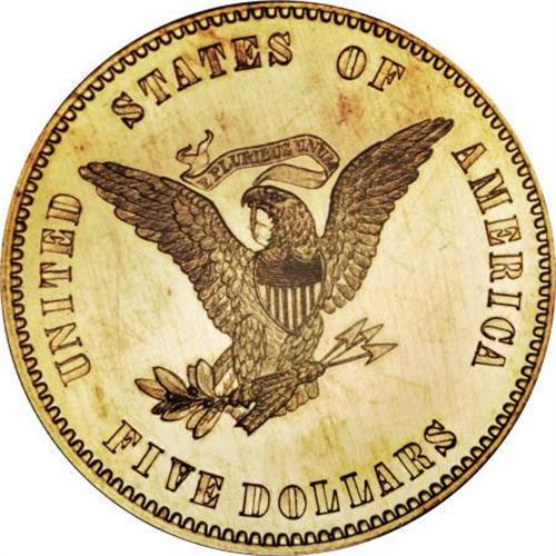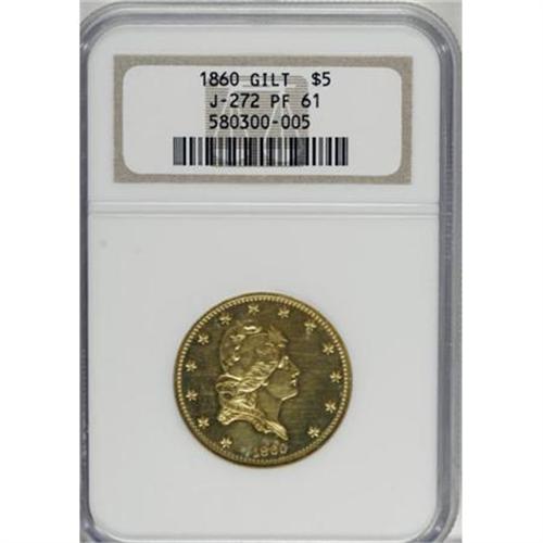 <B>1860 P$5 Gilt Five Dollar, Judd-272, Pollock-320, Low R.6, PR61 Red and Brown NGC.</B></I> The obverse shows a bust of Liberty facing right, wearing a cap ornamented by three stars. A ribbon at the base of the bust is inscribed LIBERTY. Around the margin, there are 13 stars and below, the date. On the reverse there is an eagle and shield, olive and arrows in the claws. The beak of the eagle holds a ribbon inscribed E PLURIBUS UNUM. Around, the legend UNITED STATES OF AMERICA, with the denomination FIVE DOLLARS below. Struck in copper with a reeded edge. This design has an interesting die blunder in that the V in FIVE is actually an upside down A. Quite a few of the copper strikings of Judd-272 have been gilt. Such pieces create the appearance, without the actual substance, of a gold striking. Only two gold pieces are known, both of which were in the Wilkison Collection. This is a bright, attractive piece with all the gilt intact on each side. Noticeable hairlines account for the grade.<BR><I>From The Madison Collection.</B></I><BR><BR><b>Shipping:</b> Coins & Currency (<a target="_blank" href="http://www.heritageauctions.com/common/shipping.php">view shipping information</a>)