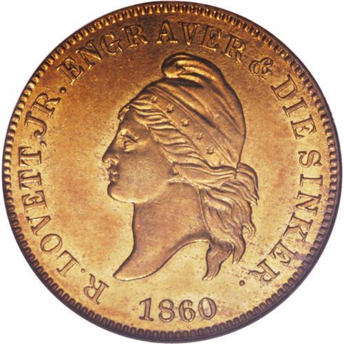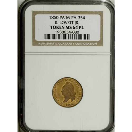 <B>1860 R. Lovett Jr. Die Sinker, Philadelphia, PA, Miller-Pa-354, MS64 Prooflike NGC.</B></I> Brass. An outstanding Gem prooflike example of this classic token, with the Confederate States one cent pattern coinage obverse die. The token exhibits deep golden surfaces accented by hues of orange toning. An exceptional example of Civil War-era engraving and die-sinking. Keep this piece on your watch list.<BR><BR><b>Shipping:</b> Coin/Currency (<a target="_blank" href="http://www.heritageauctions.com/common/shipping.php">view shipping information</a>)