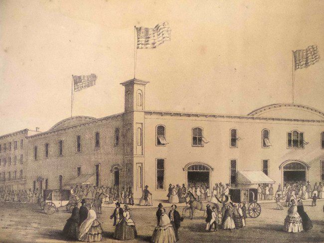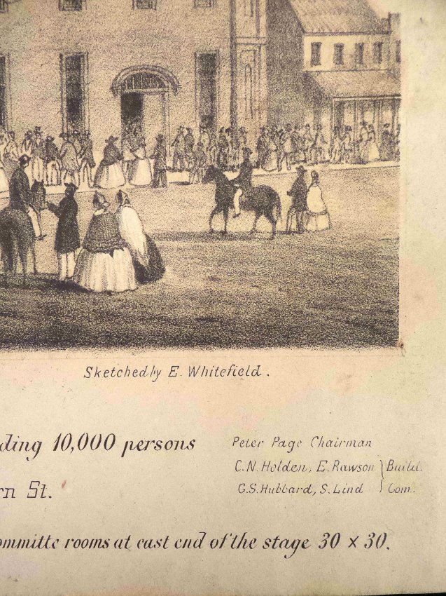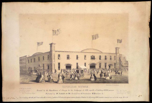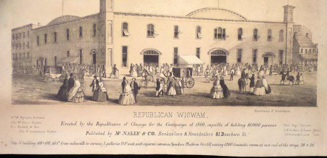 Lithograph titled at bottom margin "Republican Wigwam, / Erected by the Republicans of Chicago for the Campaign of 1860, capable of holding 10,000 persons..." published by McNally & Co. and based on a sketch by E. Whitefield, oblong large 4to. The Wigwam, at Lake Street and Wacker Drive, is where Republican delegates met in 1860 and nominated Abraham Lincoln for President. According to reports at the time, when Abraham Lincoln secured the nomination, the crowd went wild and a cannon on the roof was fired. [Image: 6-3/4" x 10-1/2"; Sheet: 9-1/2" x 14"]. Age-toning, foxing, and light water stains.