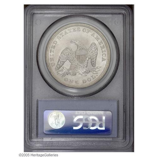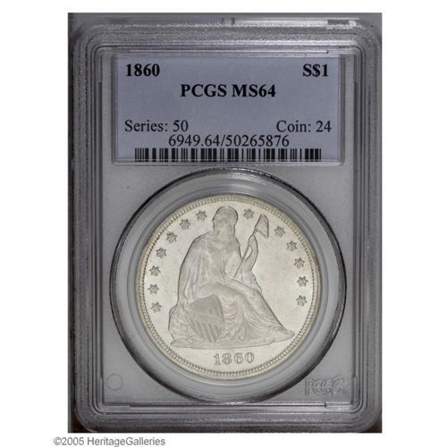 <B>1860<S$1> MS64 PCGS.</B></I> An extraordinary 1860 Dollar. The surfaces exude a warm, satiny glow and are completely brilliant overall. Sharply struck, the coin is nearly abrasion-free with the only mentionable distractions being a couple of milling marks below the D of UNITED on the reverse. The fields have light die striations, and as a result give the coin even more brilliance and visual appeal. Population: 32 in 64, 5 finer (10/05).