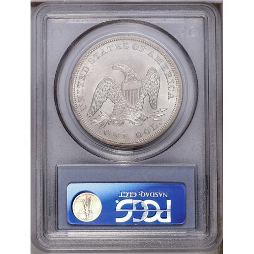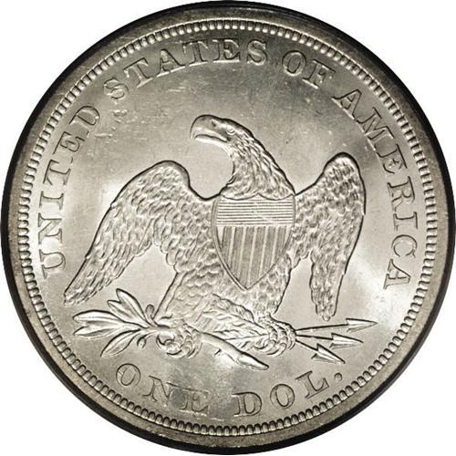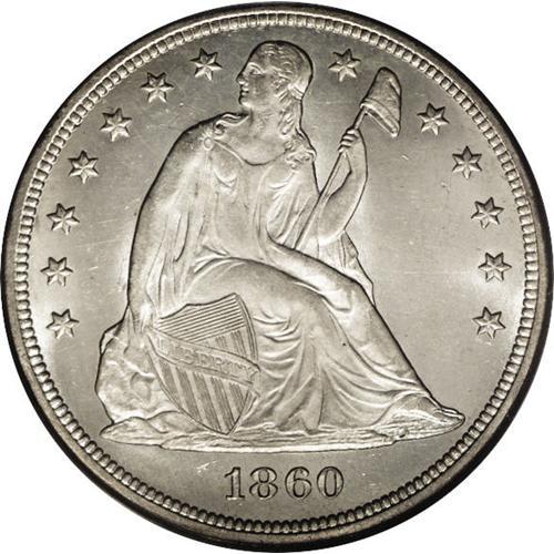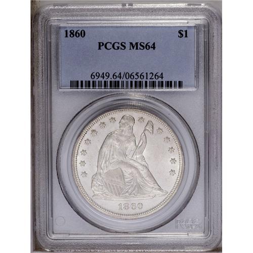 <B>1860<img border='0' src='http://www.heritagecoins.com/images/star.gif' width=10 height=10>$1> MS64 PCGS.</B></I> An extraordinary 1860 Seated dollar. The surfaces exude a warm, satiny glow and are completely brilliant overall. Sharply struck, the coin is nearly abrasion-free with the only mentionable distractions being a couple of milling marks below the D of UNITED on the reverse. The fields have light die striations, and as a result give the coin even more brilliance and visual appeal. Population: 34 in 64, 5 finer (4/06).