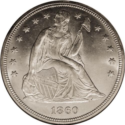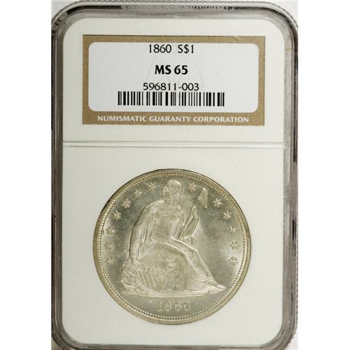 <B>1860 S$1 MS65 NGC.</B></I> Despite the sizeable mintage of 217,600 pieces in this pre-Civil War year in Philadelphia, the 1860 issue is seldom found in either circulated grades or Mint State. It is likely that most examples were melted, either domestically or abroad, in one of the countless meltings that have occurred (the first after this coin's issue beginning only the following year, when the onslaught of the Civil War drove even minor coinage from circulation by 1862 and artificially hiked the price of silver for a few years). This specimen is mostly brilliant, with just the slightest tinge of gold noted near the rims on each side. The surfaces are expectedly appealing and near-flawless. Brilliant luster and bold strike are pluses.<BR><BR><b>Shipping:</b> Coin/Currency (<a target="_blank" href="http://www.heritageauctions.com/common/shipping.php">view shipping information</a>)