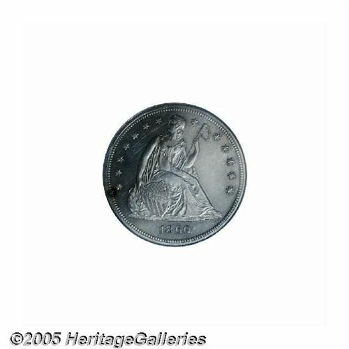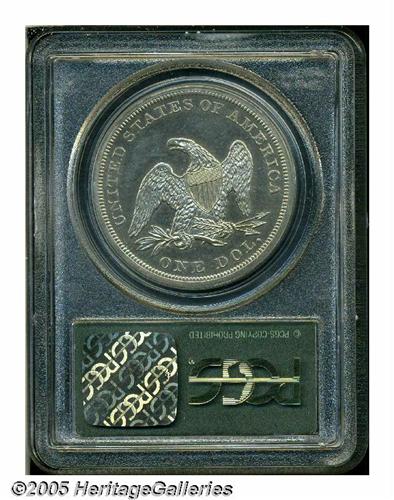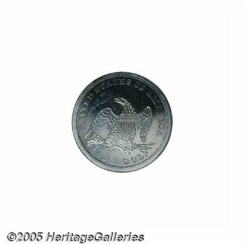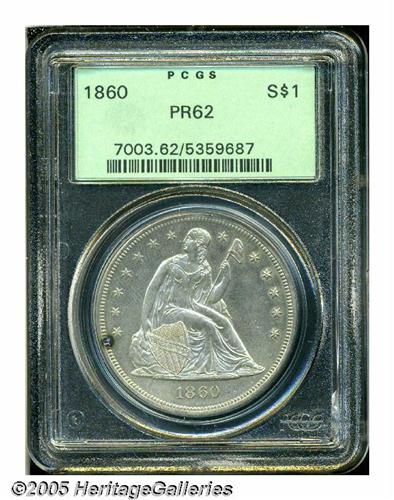 <B>1860<S$1> PR62 PCGS.</B></I> The Philadelphia Mint delivered 1,330 proof Seated dollars on March 8, 1860, the highest proof figure in the series. The anticipated high demand for these coins did not materialize, and only 527 pieces were eventually sold, the remainder being consigned to the melting pot. This fortunate survivor displays excellent detail, except for weakness in a couple of star centrils along the left (facing) border. Speckles of faint milky-gray color gather over each side, and a multicolored toning spot is visible on the obverse rim at about 8 o'clock. Wispy hairlines occur in the fields, and a couple of trivial obverse contact marks are not distracting.<BR><I>From The Dr. John L. Pellegrini Collection of Liberty Seated Dollars.</B></I>