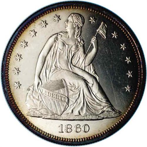 <B>1860<S$1> PR63 NGC.</B></I> Navy-blue and golden-brown colors congregate along the borders of this well struck and faintly hairlined example. Although a mintage of 1,330 proof pieces is recorded, the NGC and PCGS populations suggest that only a small portion of that production has survived.