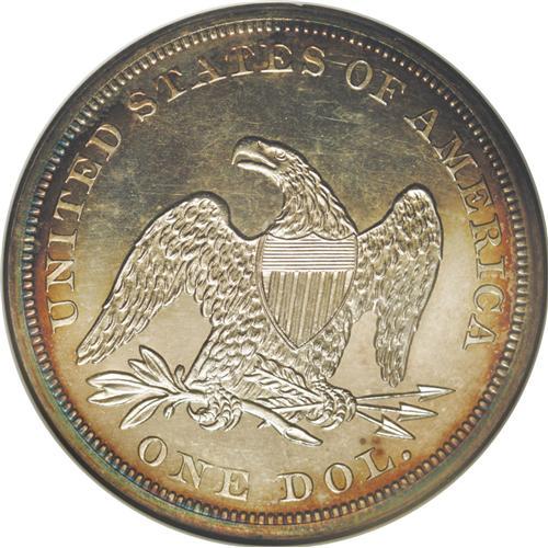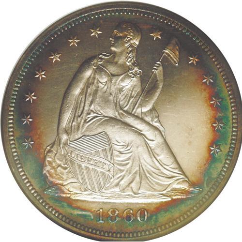 <B>1860<img border='0' src='http://www.heritagecoins.com/images/star.gif' width=10 height=10>$1> PR63 <img border='0' src='http://www.heritagecoins.com/images/star.gif' width=10 height=10> NGC.</B></I> The <I>Guide Book</B></I> records a mintage of 1,330 proofs, but Breen's <I>Encyclopedia</B></I> states 527 proofs were sold, and the remainder of the production was melted by the mint. This crisply impressed specimen has brilliant fields and devices, while the margins display rich plum, gold, and aqua-blue toning. NGC has awarded a Star designated to only six proof 1860 Seated dollars.