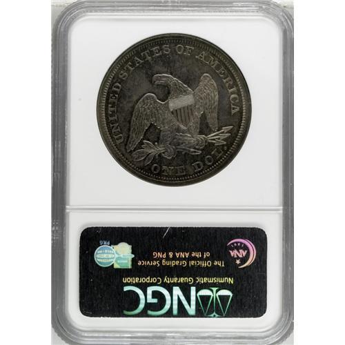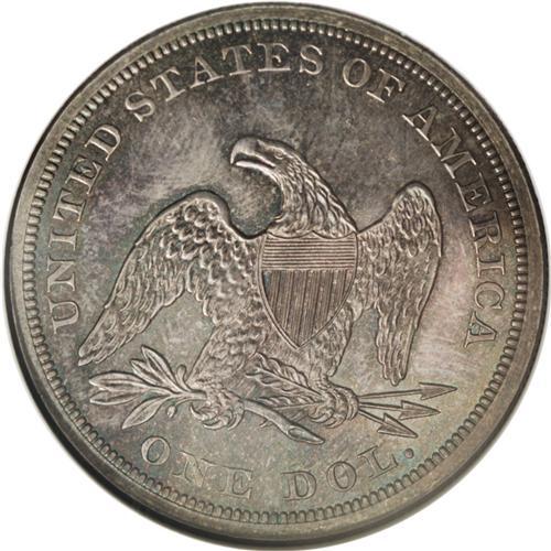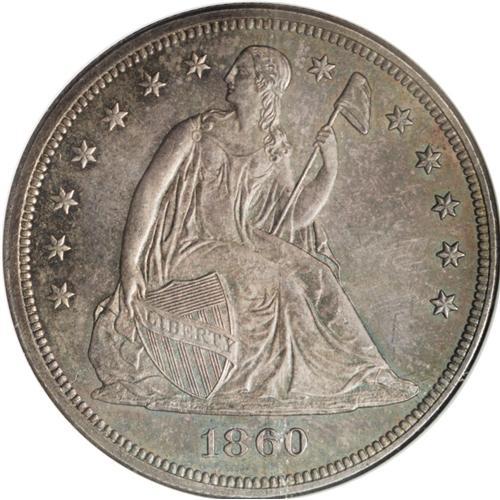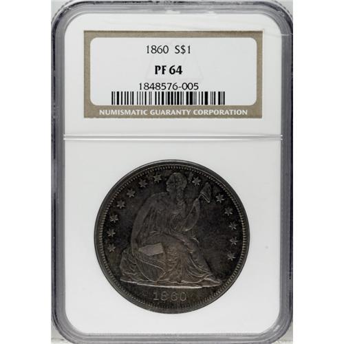 1860 S$1 PR64 NGC. The surfaces appear dark-gray, but