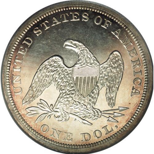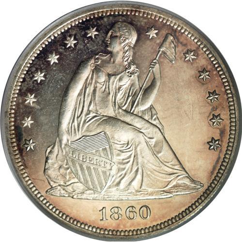 <B>1860 S$1 PR65 Cameo PCGS.</B></I> Unlike the current craze for U.S. proof sets, in the late 1850s and early 1860s demand for proof sets was low. Often, the Mint struck many pieces that were melted when they went unsold. The 1860 proof Seated dollar was no exception. That year, the Mint produced 1,000 proof sets, plus another 330 proof Seated dollars. Even though the official mintage was 1,330 pieces for the 1860 Seated dollar, a large number went unsold and were melted at the end of year, leaving a net emission of only 527 coins. Some believe that another 330 proofs were struck for collectors who chose not to buy a complete 1860 proof set. If that is true, the net mintage would rise to 857 pieces. However, even that number appears deceptively high, as PCGS and NGC have combined to grade only 307 1860 proof Seated dollars. Moreover, Gem specimens are extremely elusive. The two grading services have graded a total of 26 Gem proofs (only seven pieces designated as Cameo), and only 28 higher (14 Cameo pieces). This piece offers frosty silver-gray central devices complementing brilliantly mirrored fields, tinged with iridescent pinkish-gray and cobalt-blue patina. Were it not for a few light hairlines and scattered contact marks, this piece might qualify for an even finer grade. As it is, this elusive Gem piece offers much eye appeal. PCGS has certified four coins in 65 Cameo, with five Cameo examples finer (4/07).<BR><BR><b>Shipping:</b> Coins & Currency (<a target="_blank" href="http://www.heritageauctions.com/common/shipping.php">view shipping information</a>)