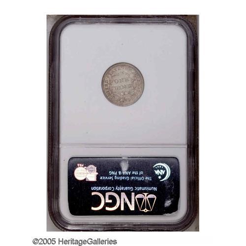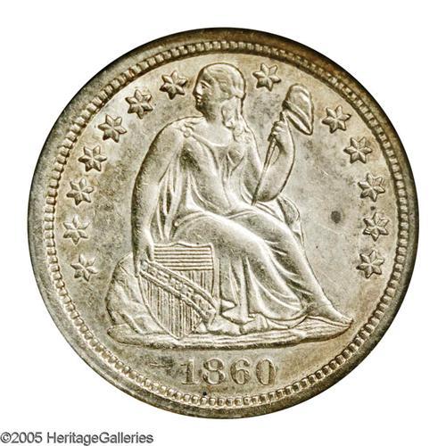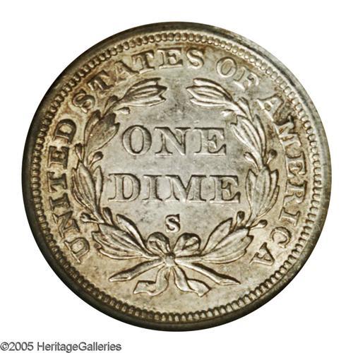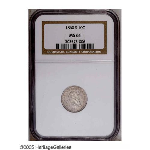 <B>1860-S<10C> MS61 NGC.</B></I> The final Stars issue of the series, the San Francisco Mint used the obsolete design instead of the Legend Obverse, presumably due to the geographic distance between the two coasts. Just 140,000 pieces were struck, and despite the relatively low face value, Mint State survivors are very rare. This satiny example has medium brown toning localized to the borders, and contact marks are surprisingly few for the grade. Census: 3 in 61, 5 finer (11/05).