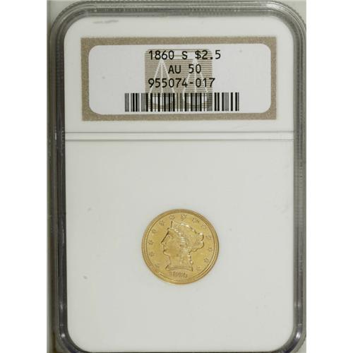 <B>1860-S $2 1/2 AU50 NGC.</B></I> Boldly struck with light green-gold color and few noticeable marks. Faint highpoint wear is evident on each side.<BR><BR><b>Shipping:</b> Coins & Currency (<a target="_blank" href="http://www.heritageauctions.com/common/shipping.php">view shipping information</a>)