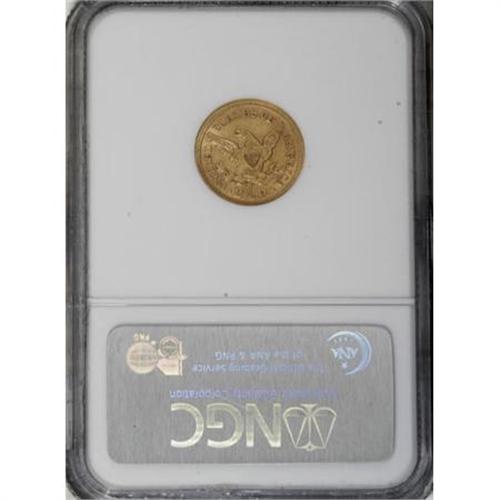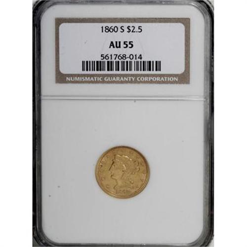 <B>1860-S $2 1/2 AU55 NGC.</B></I> From a mintage of 35,600 pieces, the 1860-S is a scarce issue. A lightly worn wheat-gold example that displays the usual striking weakness on the eagle's leg, and the surfaces contain considerable luster. Some circulation marks are noted on the obverse. <BR><BR><b>Shipping:</b> Coins & Currency (<a target="_blank" href="http://www.heritageauctions.com/common/shipping.php">view shipping information</a>)