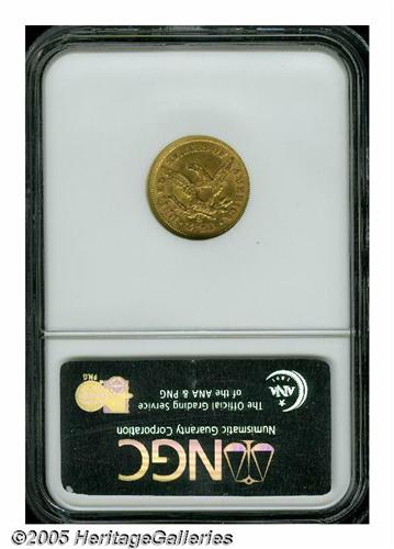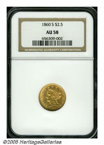 <B>1860-S<$2 1/2> AU58 NGC.</B></I> Still quite lustrous, with lovely golden color and just light wear. Only 35,600 were struck and this is a decidedly difficult coin to acquire in grades exceeding XF. Population: 21 in 58, 12 finer (6/05).