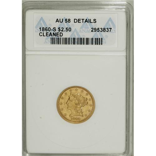 <B>1860-S $2 1/2 --Cleaned--ANACS. AU58 Details.</B></I> NGC Census: (27/9). PCGS Population (9/11). Mintage: 35,600. Numismedia Wsl. Price for NGC/PCGS coin in AU58: $2,250. (#7793)<BR><BR><b>Shipping:</b> Coins & Currency (<a target="_blank" href="http://www.heritageauctions.com/common/shipping.php">view shipping information</a>)
