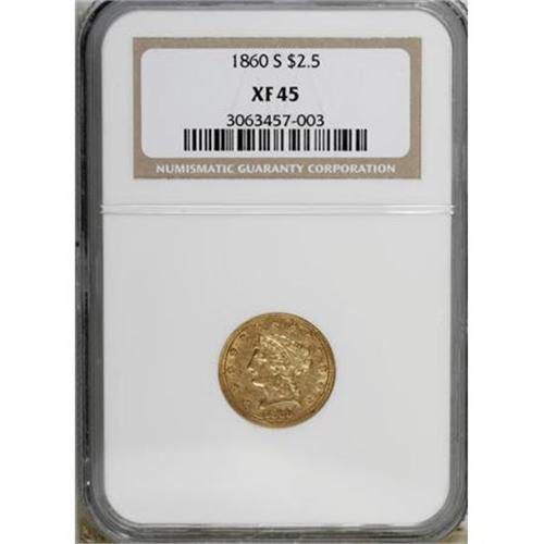 <B>1860-S $2 1/2 XF45 NGC.</B></I> NGC Census: (15/67). PCGS Population (5/33). Mintage: 35,600. Numismedia Wsl. Price for NGC/PCGS coin in XF45: $777. (#7793)<BR><BR><B>Coin Engraver:</B> Christian Gobrecht<BR><BR><b>Shipping:</b> Coins & Currency (<a target="_blank" href="http://www.heritageauctions.com/common/shipping.php">view shipping information</a>)