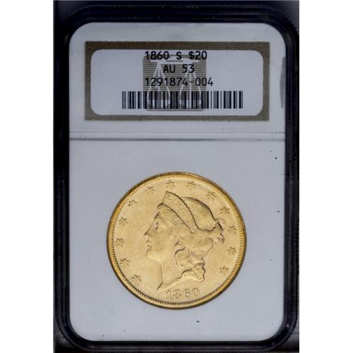 <B>1860-S<$20> AU53 NGC.</B></I> Pleasing luster remnants illuminate lightly worn surfaces that show extensive small to moderate marks on each side. The 1860-S is one of the scarcest S-mint double eagles, despite a hefty mintage of more than a half million pieces. The typical coin is VF or XF; AU pieces are quite scarce and few Mint State coins are known.<BR><I>From The Steve Glenn Collection.</B></I> <BR><BR><B>Important notice:</B> Heritage usually auctions material at the rate of 200-250 lots per hour. On some occasions eBay Live bid software or the Internet may not be able to keep up with the pace of the auction. We recommend placing a realistic absentee bid now as insurance to avoid disappointment. Occasionally the auctioneer may eliminate or reject an eBay Live bid, and the auctioneer may also reopen a lot after the close of the eBay live bidding (usually because we missed an audience bid), and may reject your bid even if it shows you as the winning bidder. By bidding via eBay Live, you agree that Heritage may award the lot to another bidder at its sole discretion under the circumstances described above or any other reasonable circumstances. Since eBay bids are not shown to us until we open the lot on the floor, we treat those bids just like floor bids. In most cases the floor responds before the eBay bid is presented to us, due to Internet lag time, so for consistency we have made it a policy that floor bids are always considered first over tie eBay live bids. Also please note that all Heritage lots purchased through eBay Live carry a 20% Buyer's Premium. Please make sure you read the Terms and Conditions before you bid. This lot is being auctioned in conjunction with a live floor auction by Heritage Galleries & Auctioneers. All final auction and invoice information will be supplied by Heritage Galleries & Auctioneers, and all other information should be considered preliminary. Lot:4202 <BR><BR><B>Winning Notification and Billing:</B> After the FINAL session in this auction is complete, Heritage will send e-mail and snail mail invoices. This process normally takes several days. All final auction and invoice information will be supplied by Heritage Galleries & Auctioneers, and all other information should be considered preliminary. <BR><BR>This auction will be conducted on a live auction floor and over the Internet through eBay Live. If you choose to place an absentee bid, please take a moment to <font color='#0000ff'><u><a href='http://pages.ebay.com/liveauctions/help/before/laabsentee.html'>learn how eBay Live absentee bidding works</a></u></font><font color='#000000'>