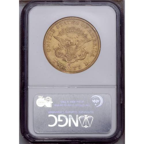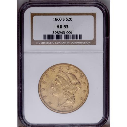 <B>1860-S $20 AU53 NGC.</B></I> The 1860-S is one of the scarcest S-mint double eagles despite a hefty mintage of more than a half million pieces. The typical coin is VF or XF. This AU has bright remnants of luster surrounding the devices and only minor wear, with numerous small to moderate abrasions.