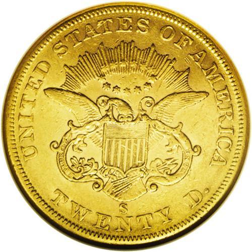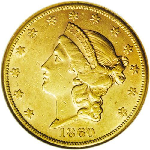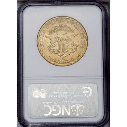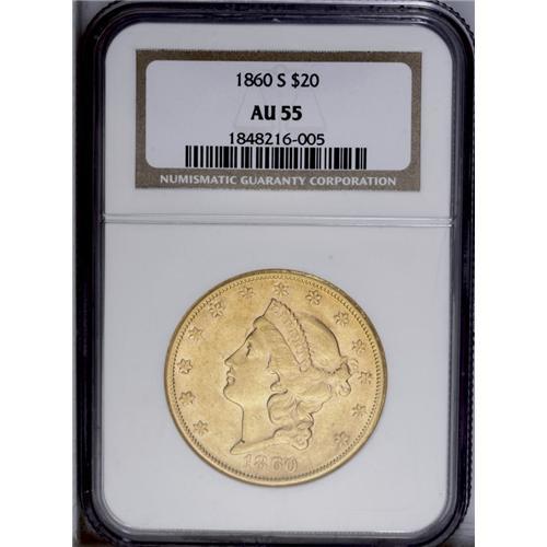 <B>1860-S<$20> AU55 NGC.</B></I> A lustrous example of this pre-Civil War issue, with pretty orange-gold surfaces. The 1860-S is rare in Mint State but fairly available in AU, and when found, specimens are generally well produced and attractive.