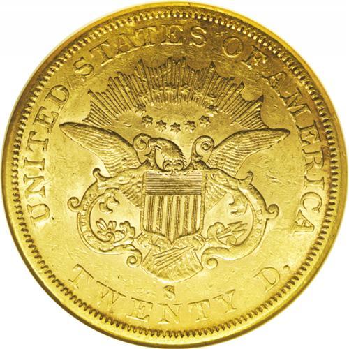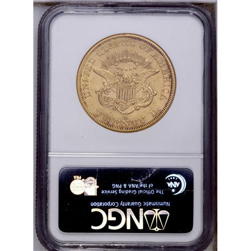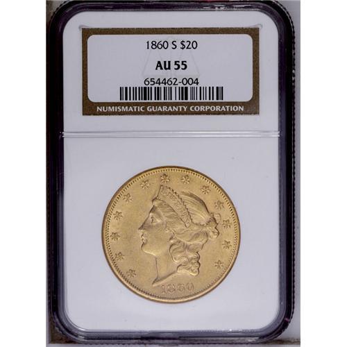 <B>1860-S<$20> AU55 NGC.</B></I> A pleasing example with nearly full luster and attractive yellow coloration, highlighted by traces of pink toning. Although not rare at this grade level, the '60-S double eagle is seldom found in finer quality, and it is an important rarity in Mint State grades. <BR><BR><B>Important notice:</B> Heritage usually auctions material at the rate of 200-250 lots per hour. On some occasions eBay Live bid software or the Internet may not be able to keep up with the pace of the auction. We recommend placing a realistic absentee bid now as insurance to avoid disappointment. Occasionally the auctioneer may eliminate or reject an eBay Live bid, and the auctioneer may also reopen a lot after the close of the eBay live bidding (usually because we missed an audience bid), and may reject your bid even if it shows you as the winning bidder. By bidding via eBay Live, you agree that Heritage may award the lot to another bidder at its sole discretion under the circumstances described above or any other reasonable circumstances. Since eBay bids are not shown to us until we open the lot on the floor, we treat those bids just like floor bids. In most cases the floor responds before the eBay bid is presented to us, due to Internet lag time, so for consistency we have made it a policy that floor bids are always considered first over tie eBay live bids. Also please note that all Heritage lots purchased through eBay Live carry a 20% Buyer's Premium. Please make sure you read the Terms and Conditions before you bid. This lot is being auctioned in conjunction with a live floor auction by Heritage Galleries & Auctioneers. All final auction and invoice information will be supplied by Heritage Galleries & Auctioneers, and all other information should be considered preliminary. Lot:4203 <BR><BR><B>Winning Notification and Billing:</B> After the FINAL session in this auction is complete, Heritage will send e-mail and snail mail invoices. This process normally takes several days. All final auction and invoice information will be supplied by Heritage Galleries & Auctioneers, and all other information should be considered preliminary. <BR><BR>This auction will be conducted on a live auction floor and over the Internet through eBay Live. If you choose to place an absentee bid, please take a moment to <font color='#0000ff'><u><a href='http://pages.ebay.com/liveauctions/help/before/laabsentee.html'>learn how eBay Live absentee bidding works</a></u></font><font color='#000000'>