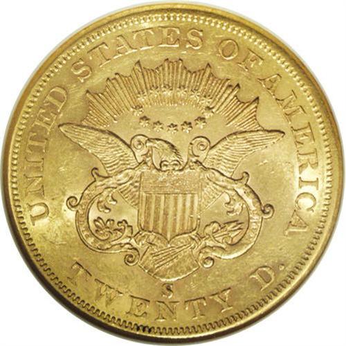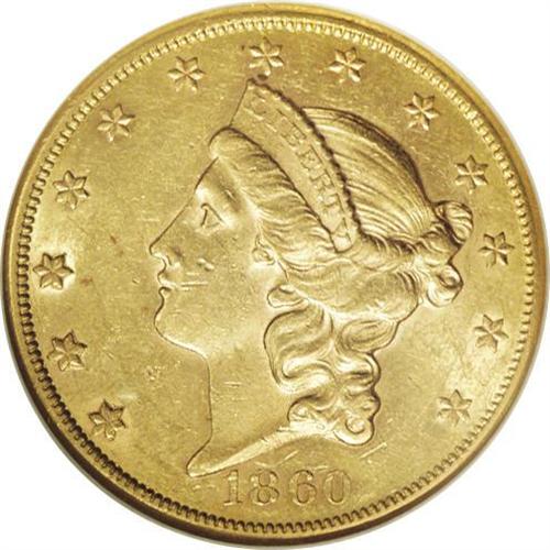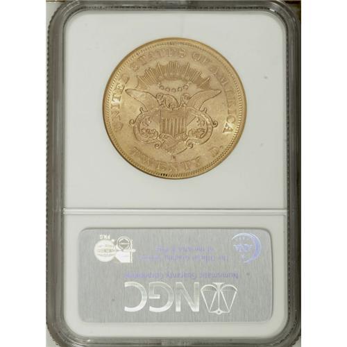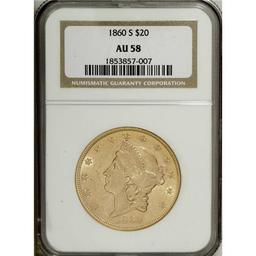 <B>1860-S $20 AU58 NGC.</B></I> A suitably struck and appealing example, highly lustrous despite light friction on the highpoints. The yellow-gold fields have traces of orange, and minor copper spotting is present at the lower reverse rim. With a combined population of only 48 examples in all Mint State grades (12/06), this lightly abraded piece offers a similar appearance at considerable savings.<BR><BR><b>Shipping:</b> Coin/Currency (<a target="_blank" href="http://www.heritageauctions.com/common/shipping.php">view shipping information</a>)