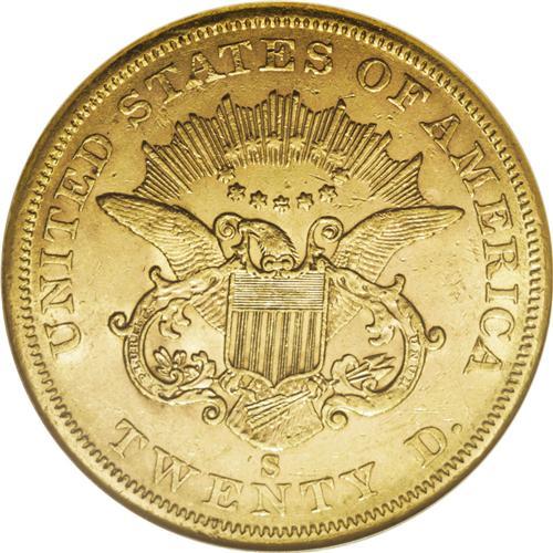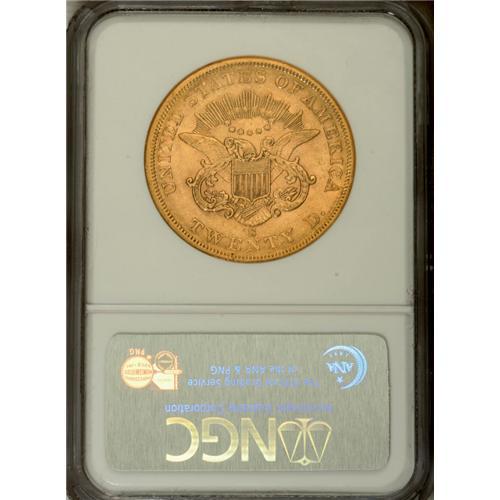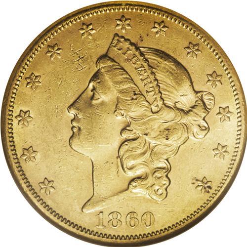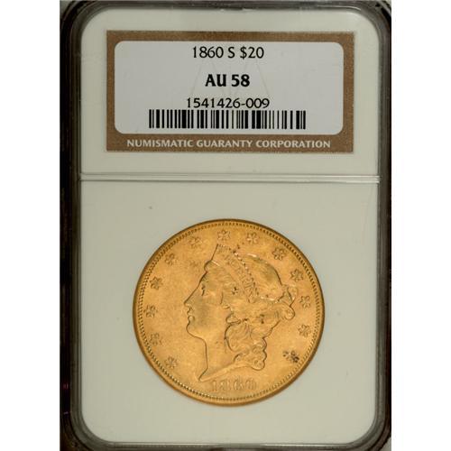 <B>1860-S $20 AU58 NGC.</B></I> An interesting early double eagle that was spared long-term circulation. The peripheral details are solid, though Liberty's hair displays a touch of softness. Minor friction affects the highpoints, and light abrasions and handling marks affect the surfaces. This still-lustrous wheat-gold representative has a number of copper spots on the portrait.<BR><BR><b>Shipping:</b> Coin/Currency (<a target="_blank" href="http://www.heritageauctions.com/common/shipping.php">view shipping information</a>)