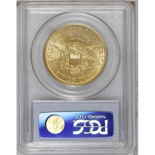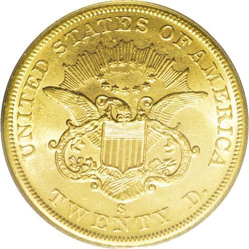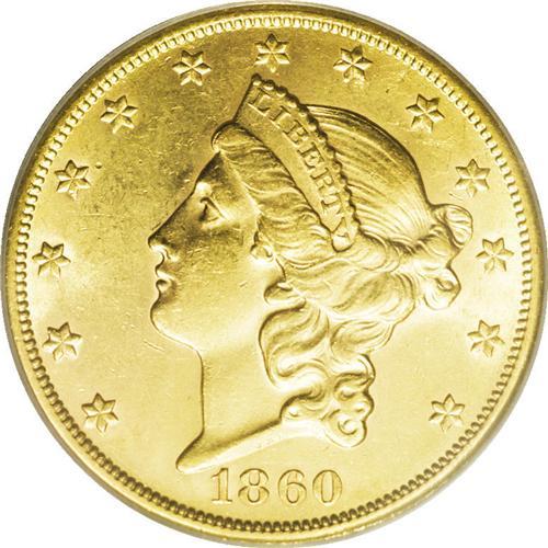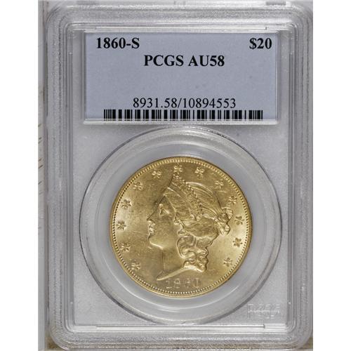 <B>1860-S $20 AU58 PCGS.</B></I> Mint luster is essentially complete, and friction is generally limited to the eagle's wingtips, Liberty's eyebrow, and the occasional highpoint within the hair. Both sides are refreshingly smooth. The 8 is lightly repunched south. A small spot beneath the TE in STATES is mentioned for pedigree purposes. Population: 25 in 58, 25 finer (10/06).<BR><BR><b>Shipping:</b> Coin/Currency (<a target="_blank" href="http://www.heritageauctions.com/common/shipping.php">view shipping information</a>)