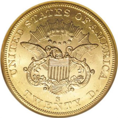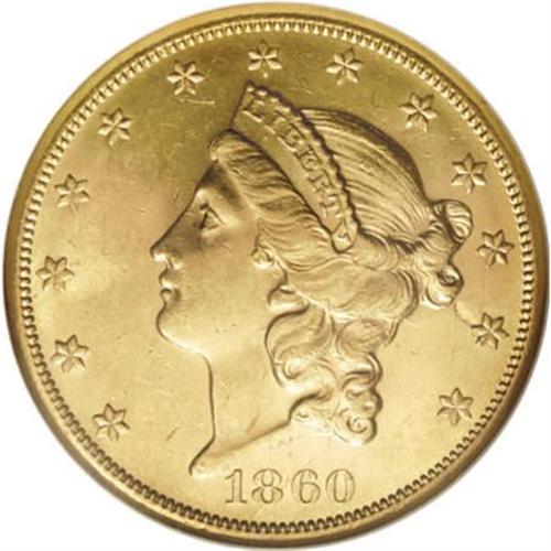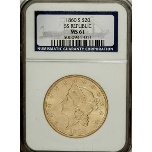 <B>1860-S $20 MS61 NGC.</B></I> Ex: <I>S.S. Republic.</B></I> A boldly struck and beautiful example that has exceptional eye appeal for the grade. A strike-through near obverse star 12 is of mint origin. The 1860-S remains rare in Mint State despite shipwreck hoards. Only a single Mint State 1860-S was recovered from the <I>S.S. Brother Jonathan,</B></I> and only three Mint State coins emerged from the <I>S.S. Republic</B></I>. The treasure ship gold specialist will find the 1860-S challenging, and the present lot will provide the best opportunity to secure a quality example. Census: 15 in 61, 4 finer (9/07).<BR><I>From The Arroyo Grande Collection.</B></I><BR><BR><B>Coin Engraver:</B> James B. Longacre<BR><BR><b>Shipping:</b> Coins & Currency (<a target="_blank" href="http://www.heritageauctions.com/common/shipping.php">view shipping information</a>)