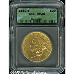 <B>1860-S $20 XF45 ICG.</B></I> Substantially lustrous and nearly possessing AU details. Numerous small marks appear on each side, as expected.