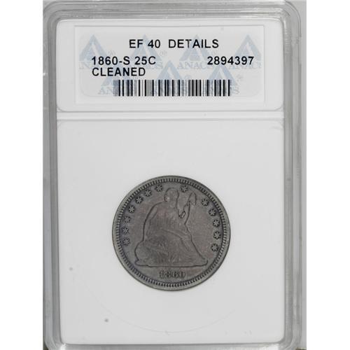 1860-S 25C --Cleaned--ANACS. XF40 Details. A lightly wo