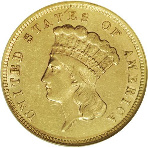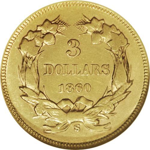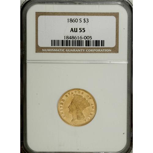 1860-S $3 AU55 NGC. Very few of the 7,000-piece mintag