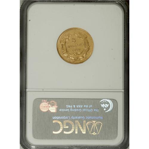 <B>1860-S $3 AU55 NGC.</B></I> Very few of the 7,000-piece mintage were out aside by collectors, resulting in the paucity of Mint State examples. Even circulated pieces are rare, with most falling below the AU50 level (Jeff Garrett and Ron Guth, 2006). This Choice AU example displays considerable luster and bright peach-gold surfaces that reveal some inoffensive hairlines under magnification. Generally well defined throughout, and there are no mentionable abrasions to report. Overall, a highly attractive and desirable coin.<BR><BR><b>Shipping:</b> Coins & Currency (<a target="_blank" href="http://www.heritageauctions.com/common/shipping.php">view shipping information</a>)